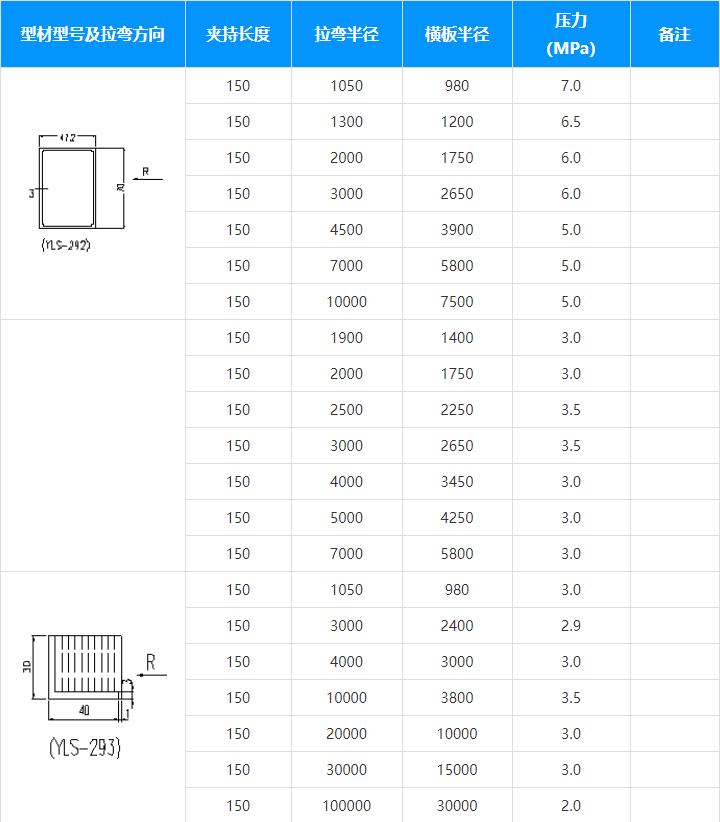 為了避免設備損壞,一定要按設備性能及要求進行工作。不允許超負荷運作。每次工作結束后,對易損件進行檢查。工作表面擦試干凈,尤其是油缸桿要經常保持清潔,應經常在導軌和轉動部件注油。(常用型材拉彎所需油壓和模板半徑參考數值表附后)